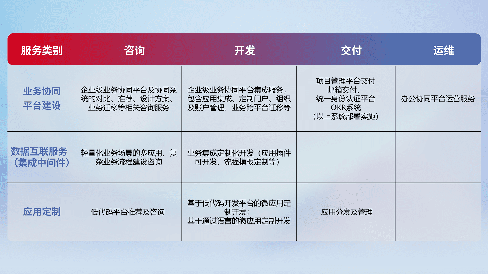 针对钉钉、、、企微、、、、IDaas等平台级产品提供产品的规划、、、方案、、、交付、、、定制化开发等服务,,,,实现如统一协同办公、、、、智能客户服务、、、、混合会议管理、、智能数据查询、、等业务场景,,实现数字化转型。。。