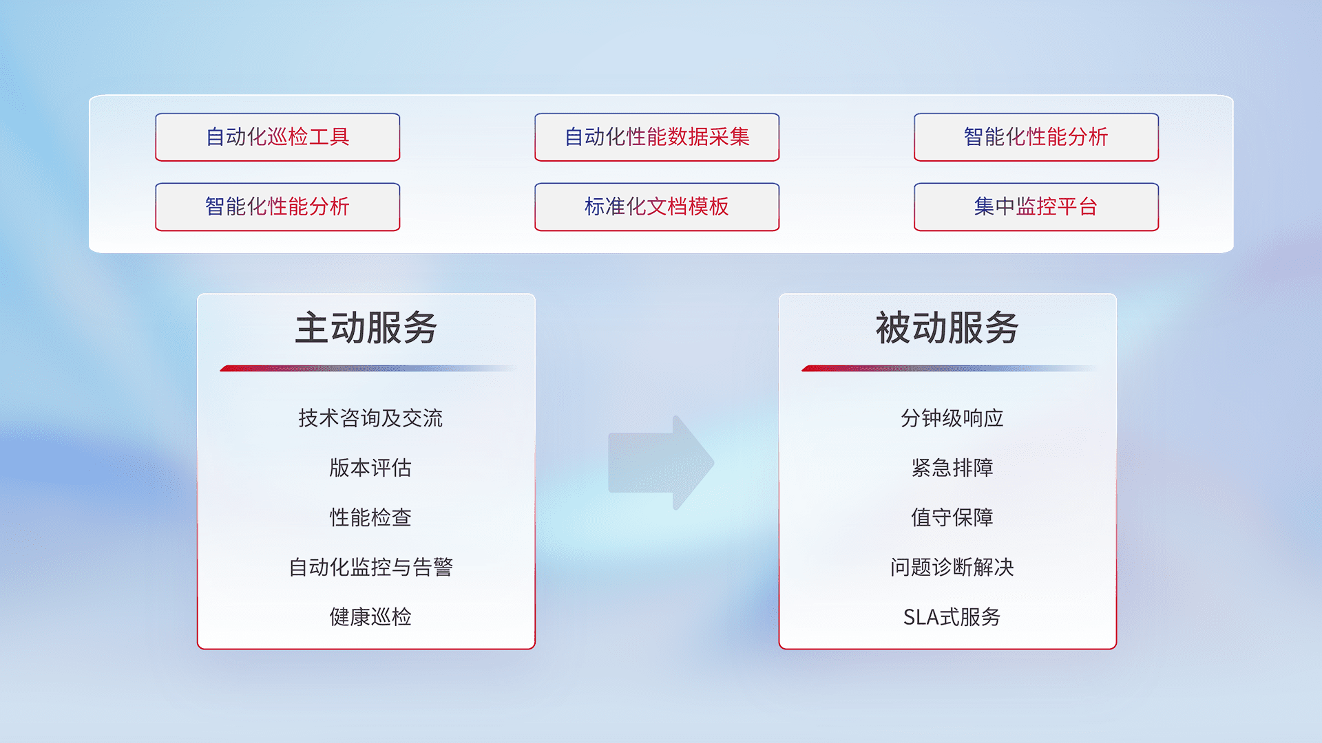 智能化工具和标准化文档,,,保障服务质量,,,,提供主动服务(包含技术咨询、、、、版本评估、、、、性能检查、、自动化监控与告警、、健康巡检)和被动服务包含(分钟级响应、、紧急排障、、值守保障、、、问题诊断解决、、、SLA服务)。。